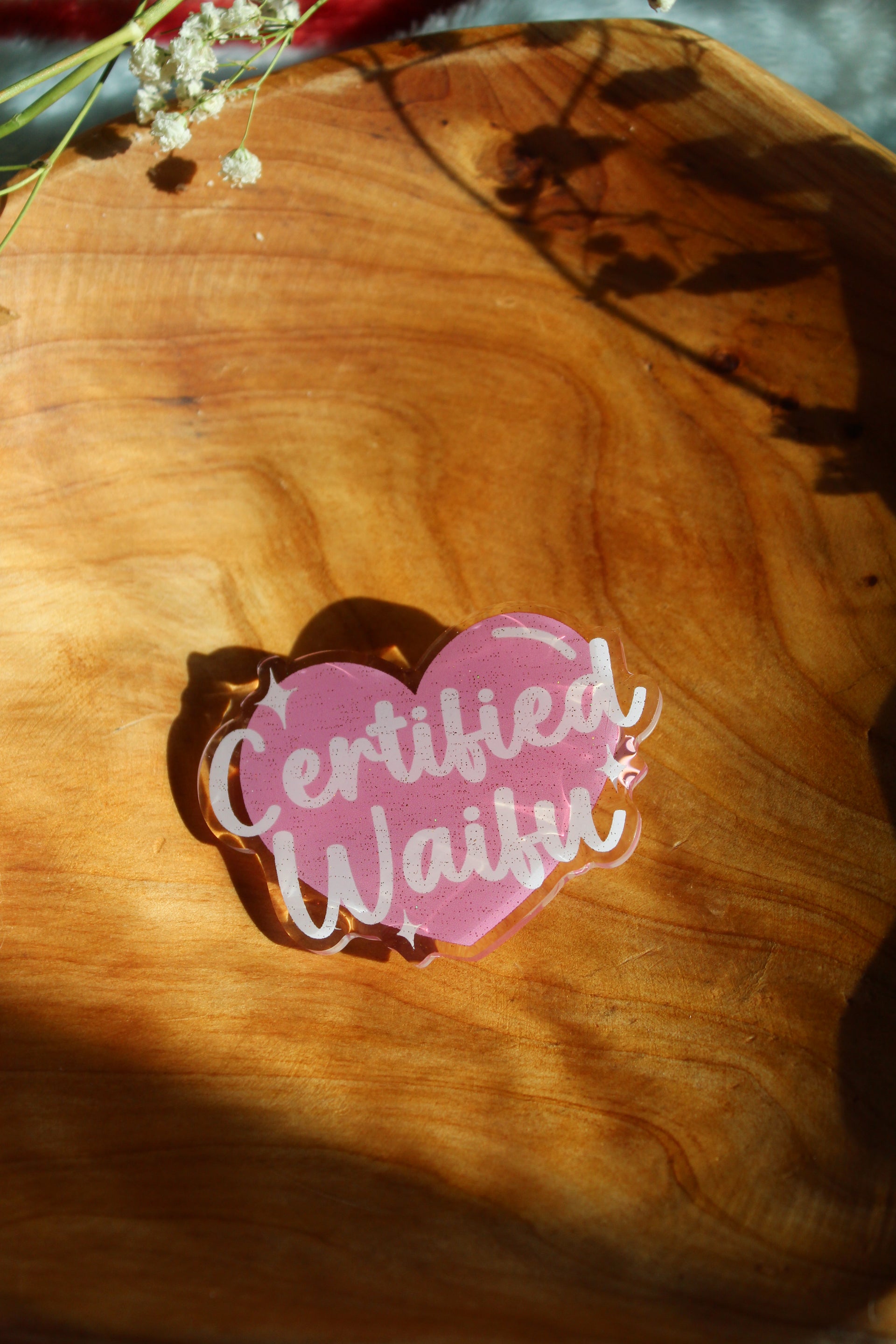 - Printed clear acrylic with glitter epoxy front