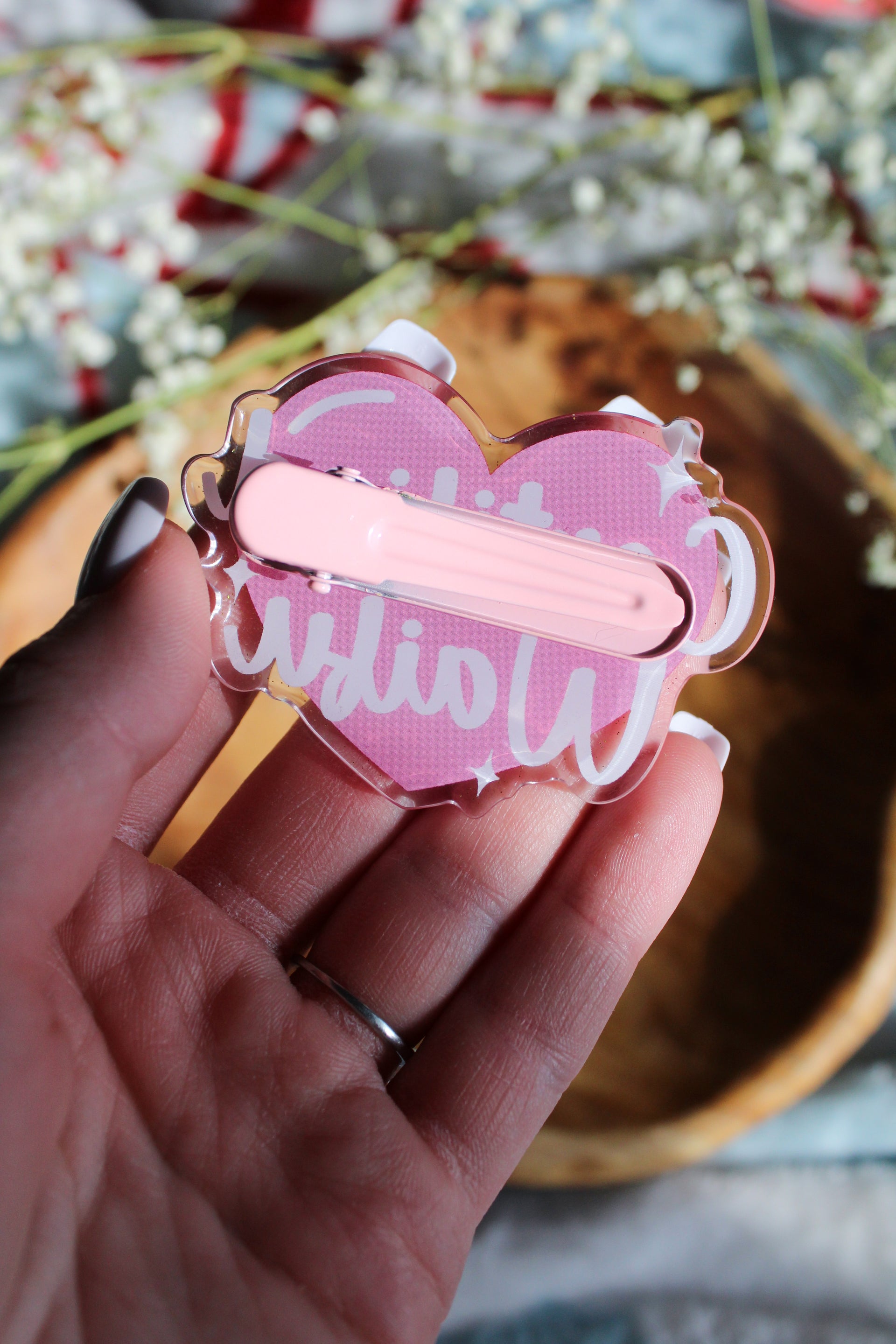 - Mounted on pink hair clip