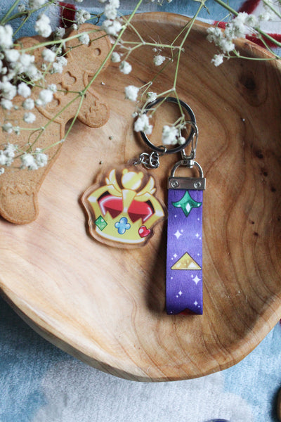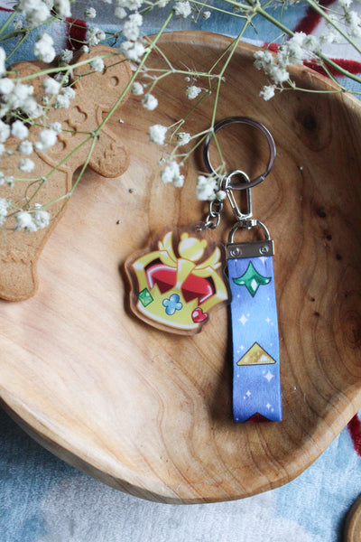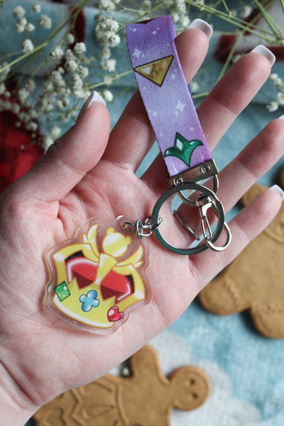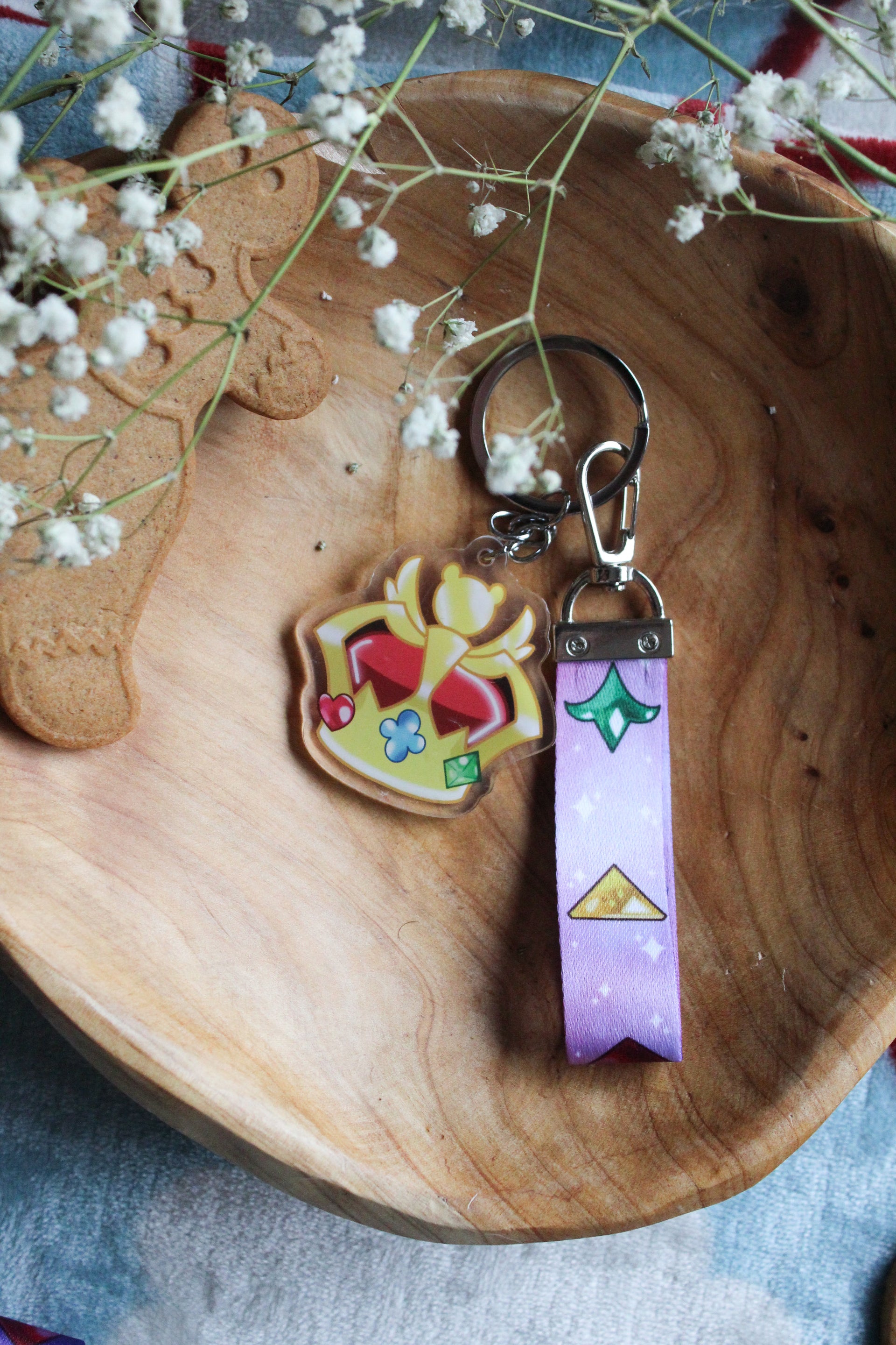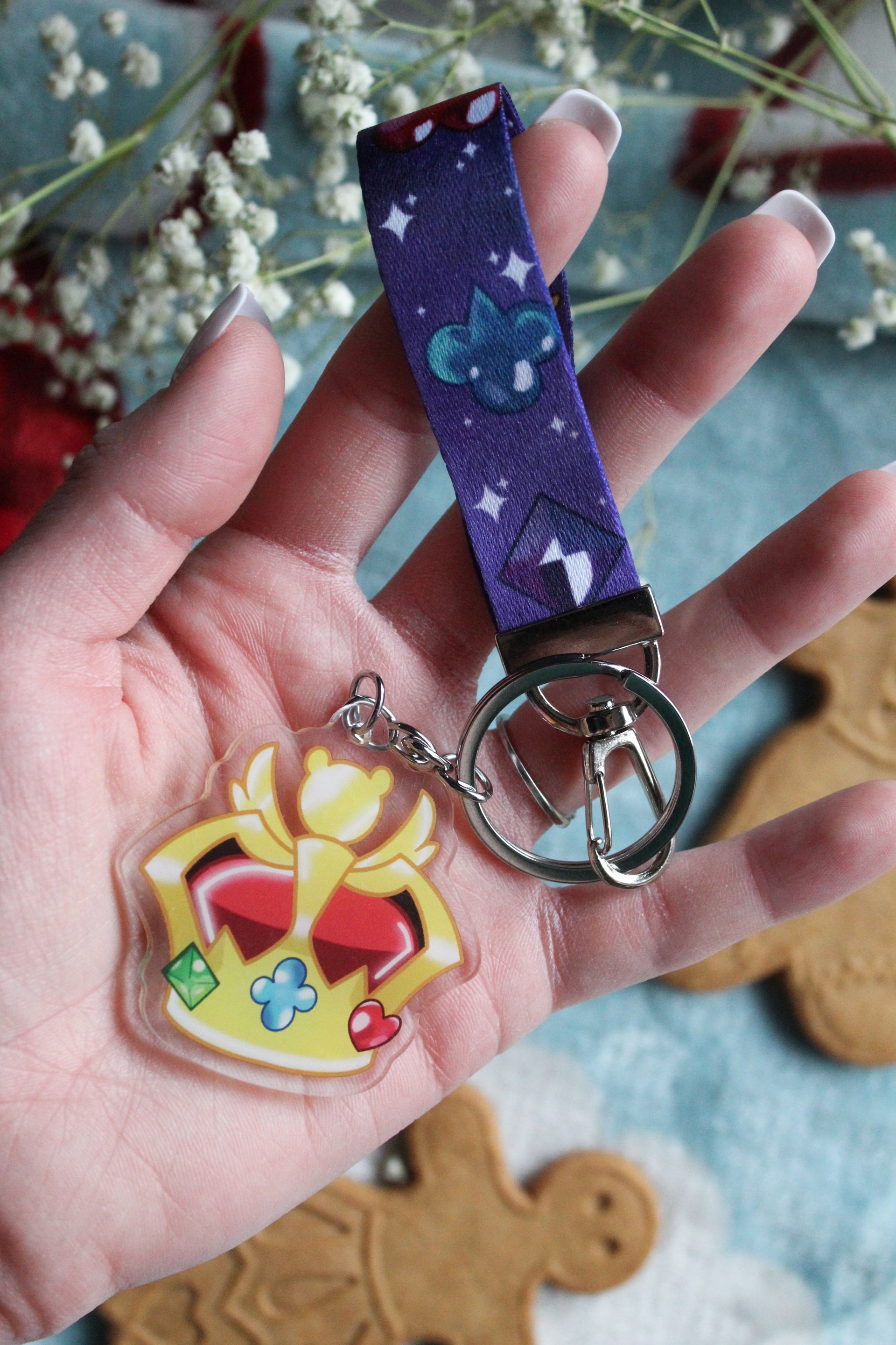 - Included keychain is printed clear acrylic with glitter epoxy front and measures 2" tall by 2" wide + 1/8" thick