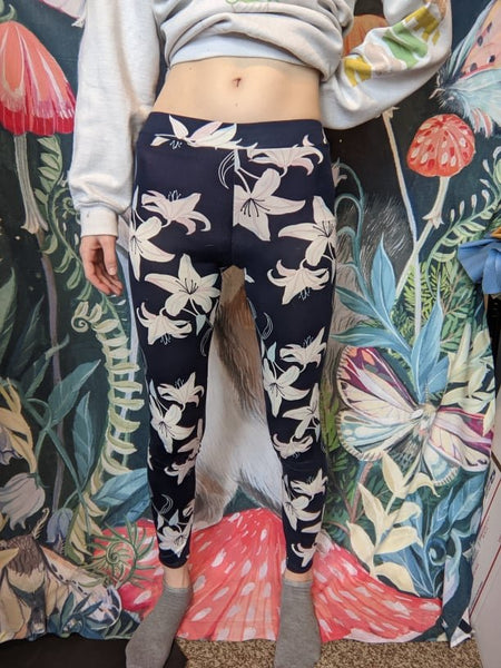 Spandex leggings inspired by the protagonist’s uniform from Shin Megami Tensei V. Navy spandex print featuring white, pink, and blue flowers. Handmade to order. Limited quantity available due to limited fabric yardage. Fabric is slightly thin, and as such I recommend only wearing these leggings around the house!