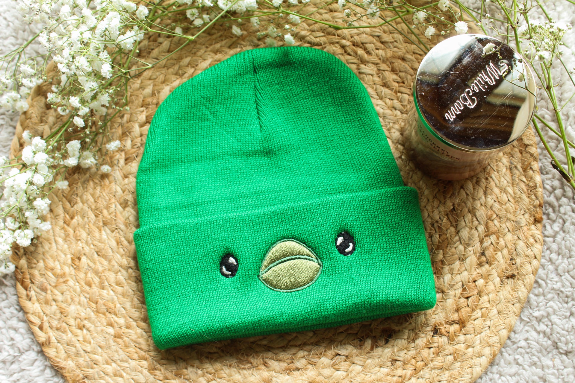 - Available in green with multicolored embroidery