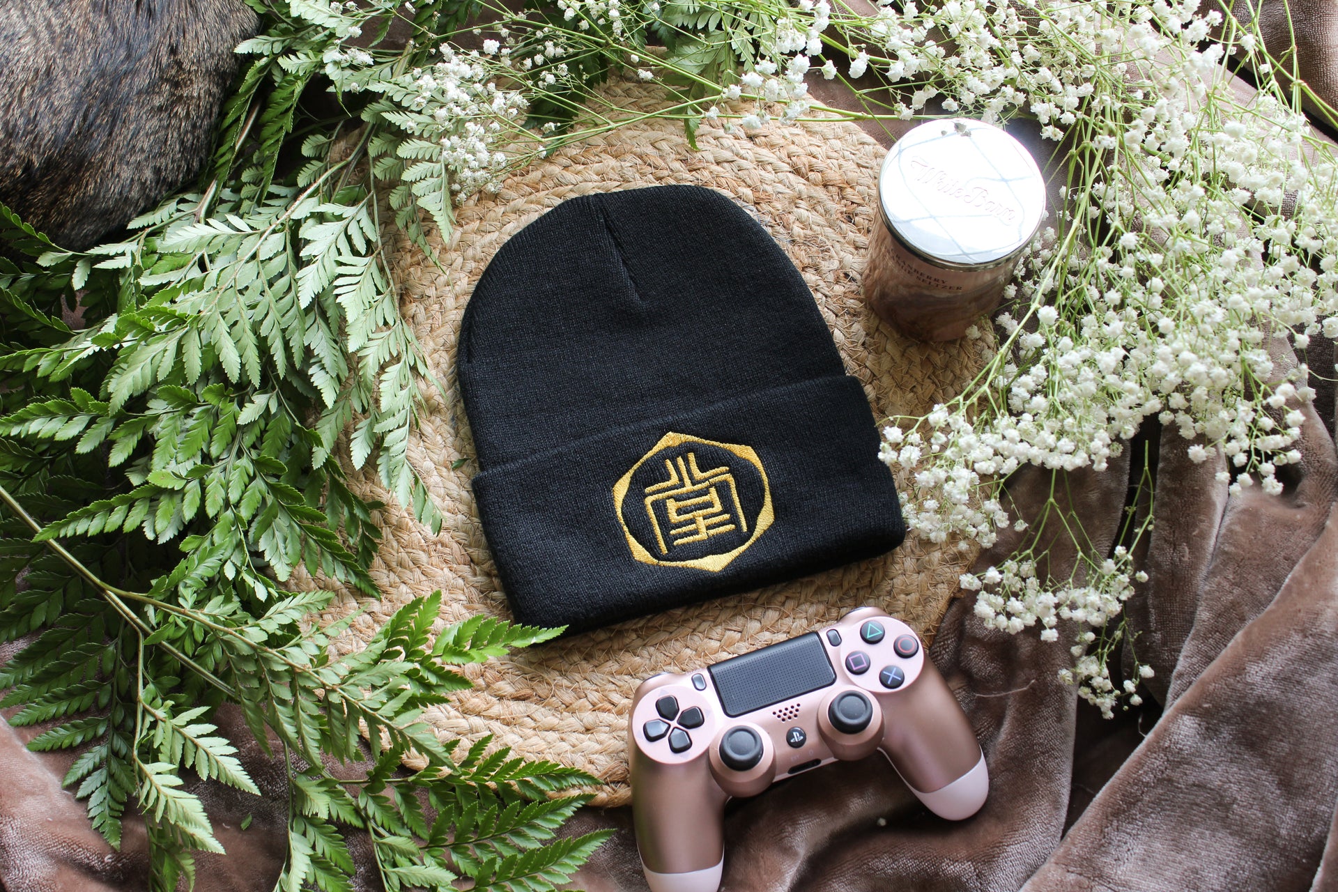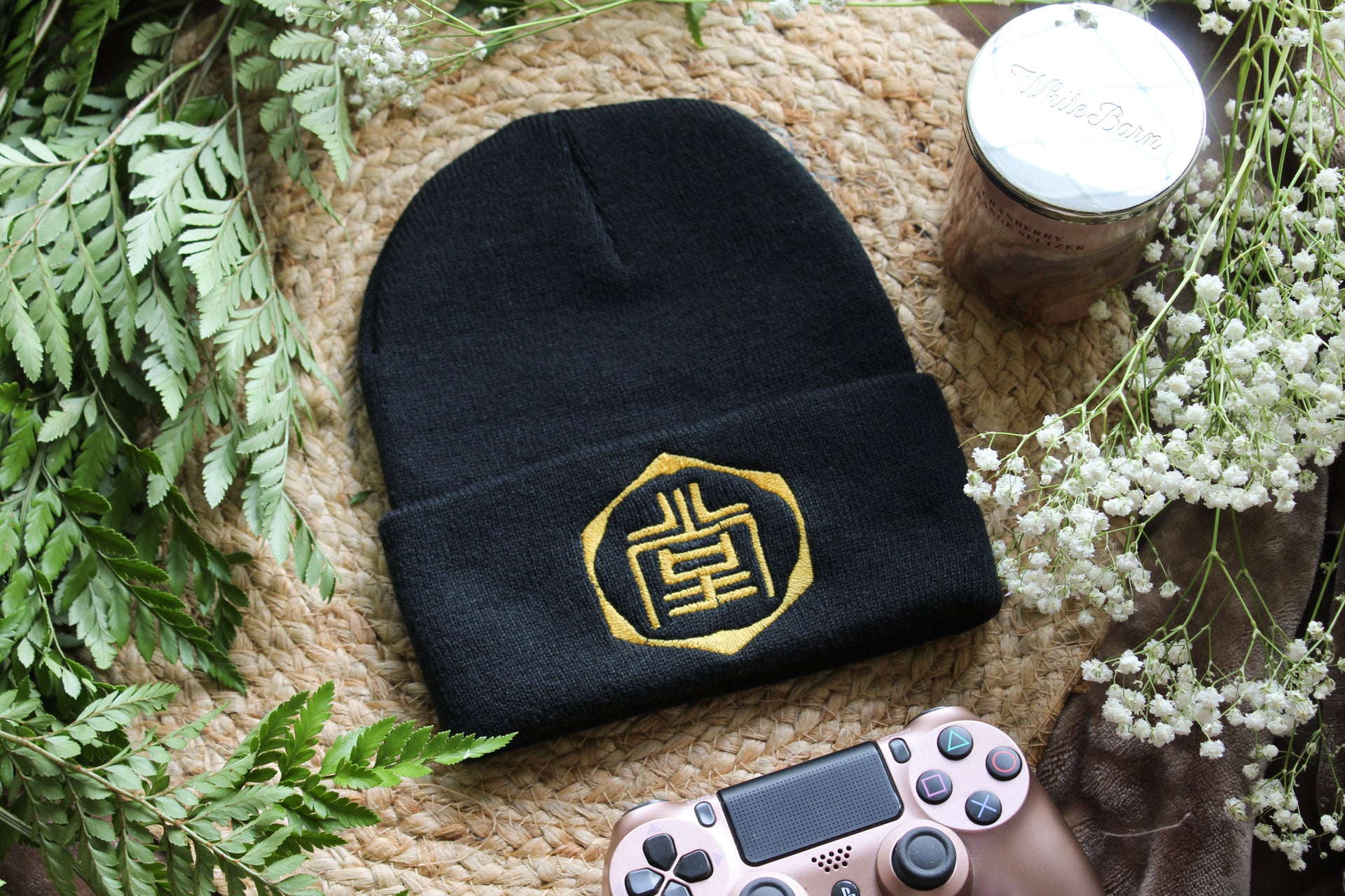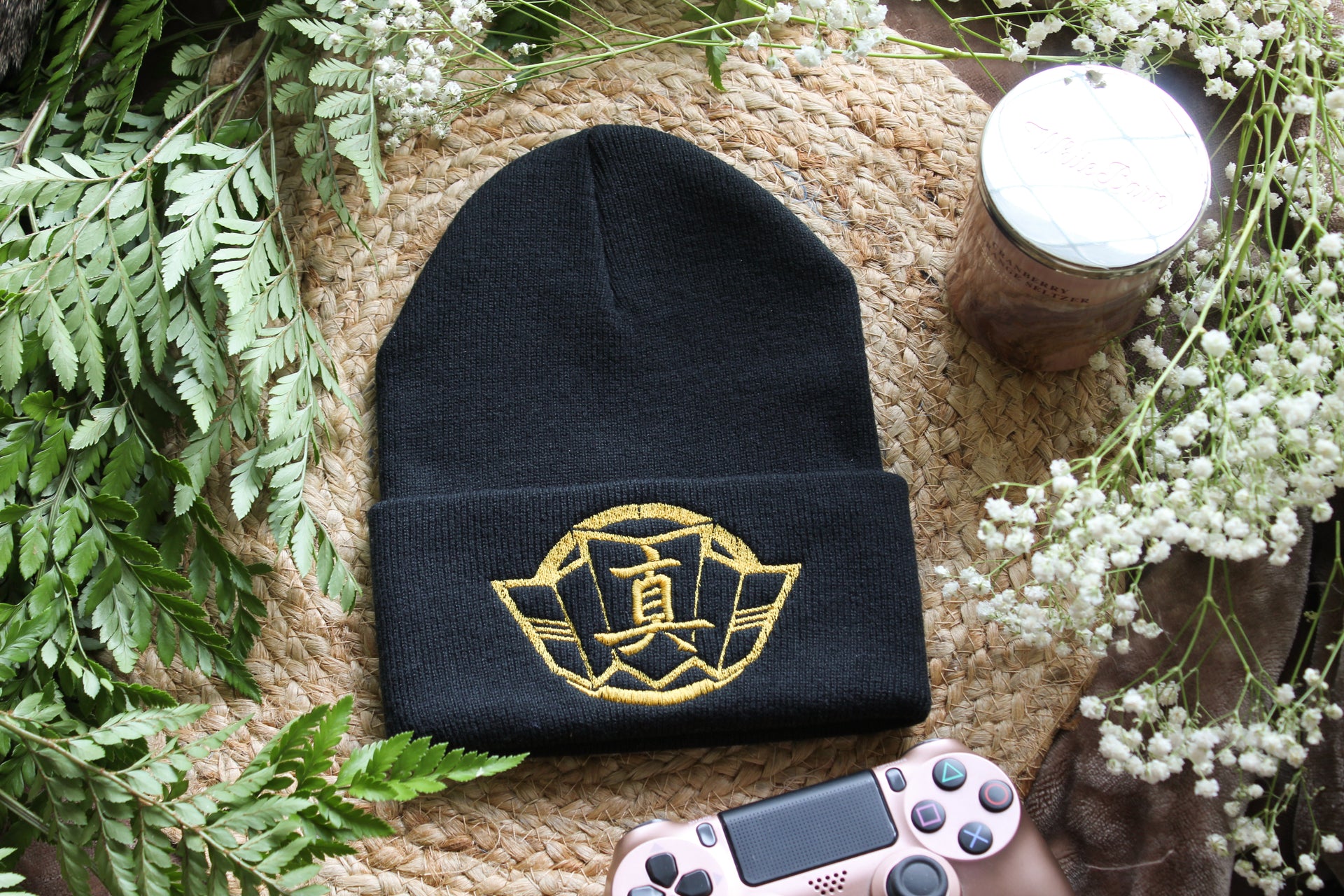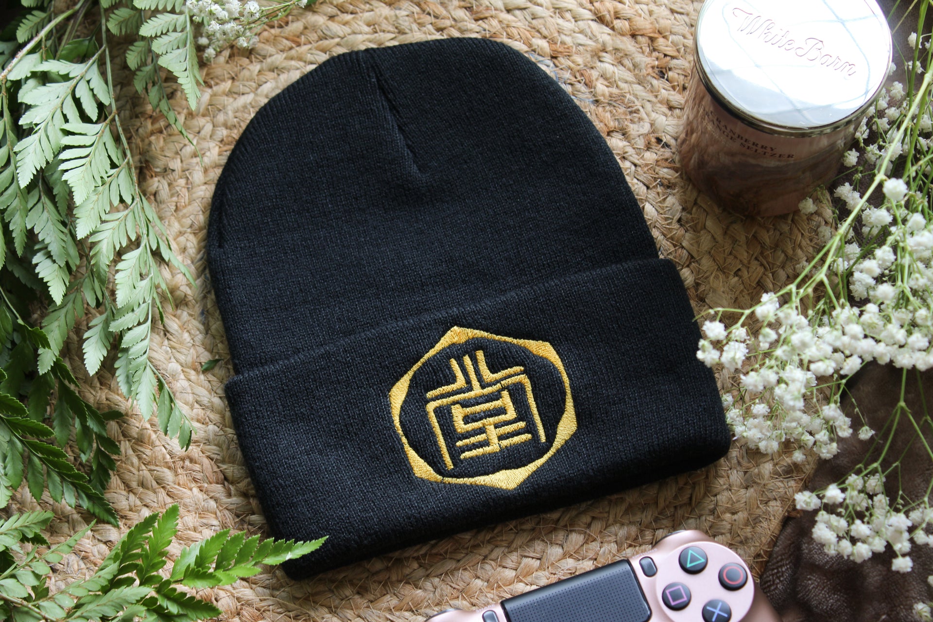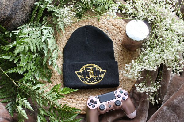 - Black beanie with gold thread
