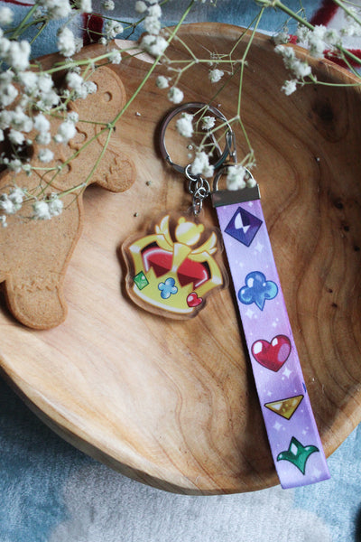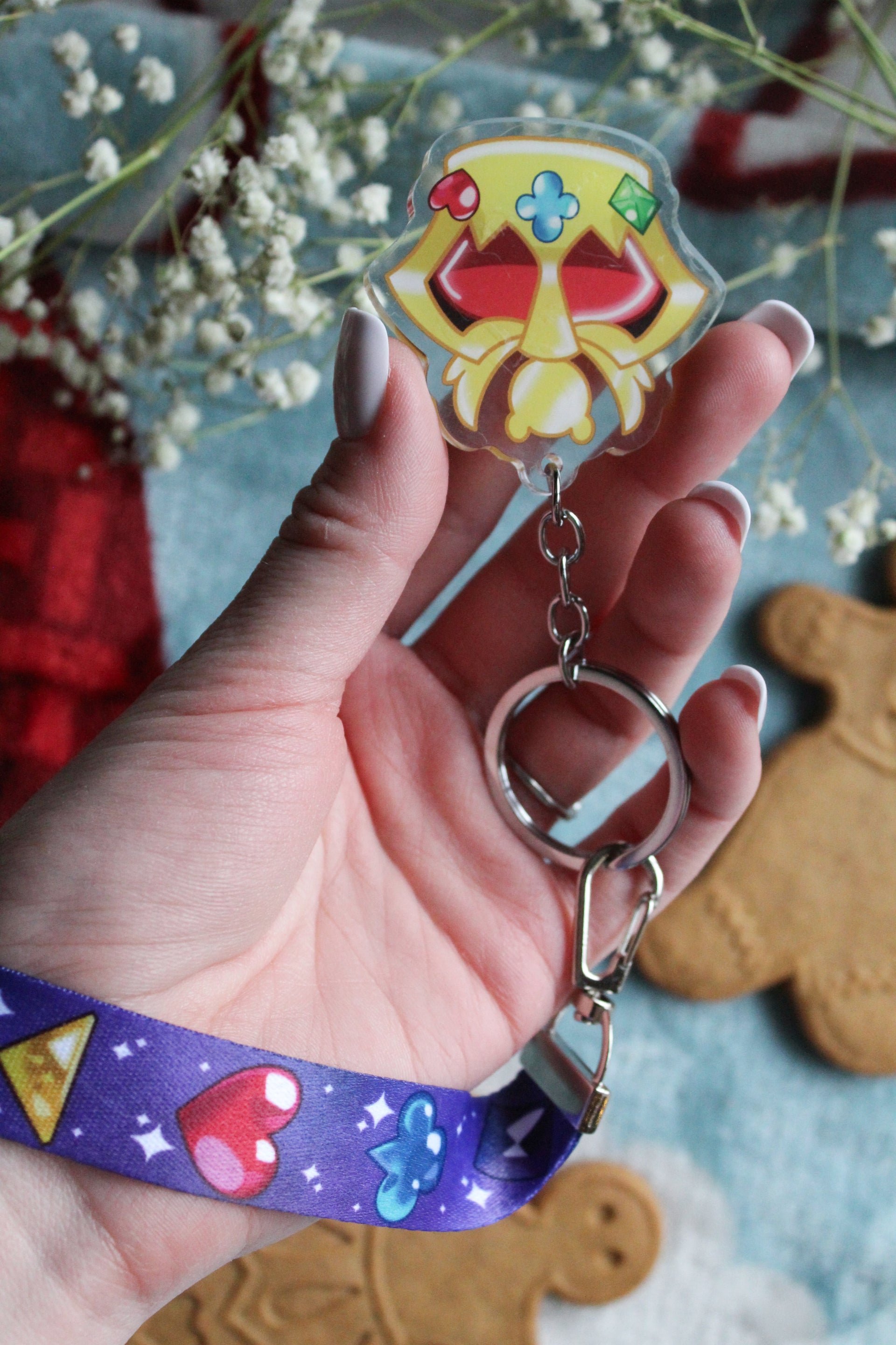 - Included keychain is printed clear acrylic with glitter epoxy front and measures 2" tall by 2" wide + 1/8" thick