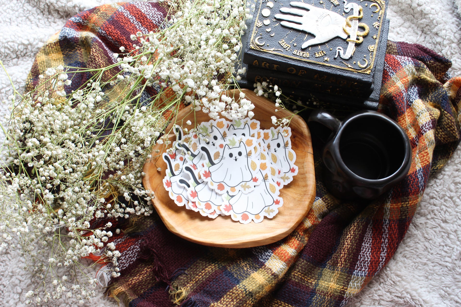Ghost Cat Leaves 3" Clear Vinyl Stickers