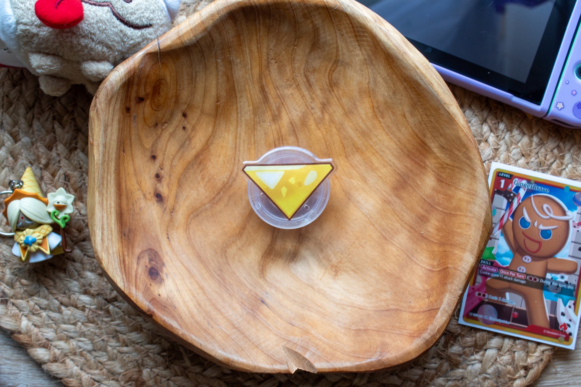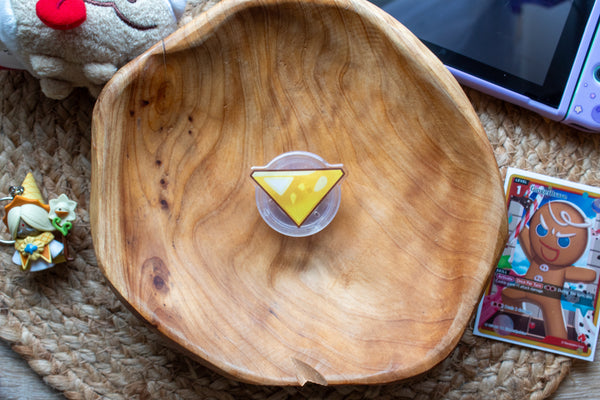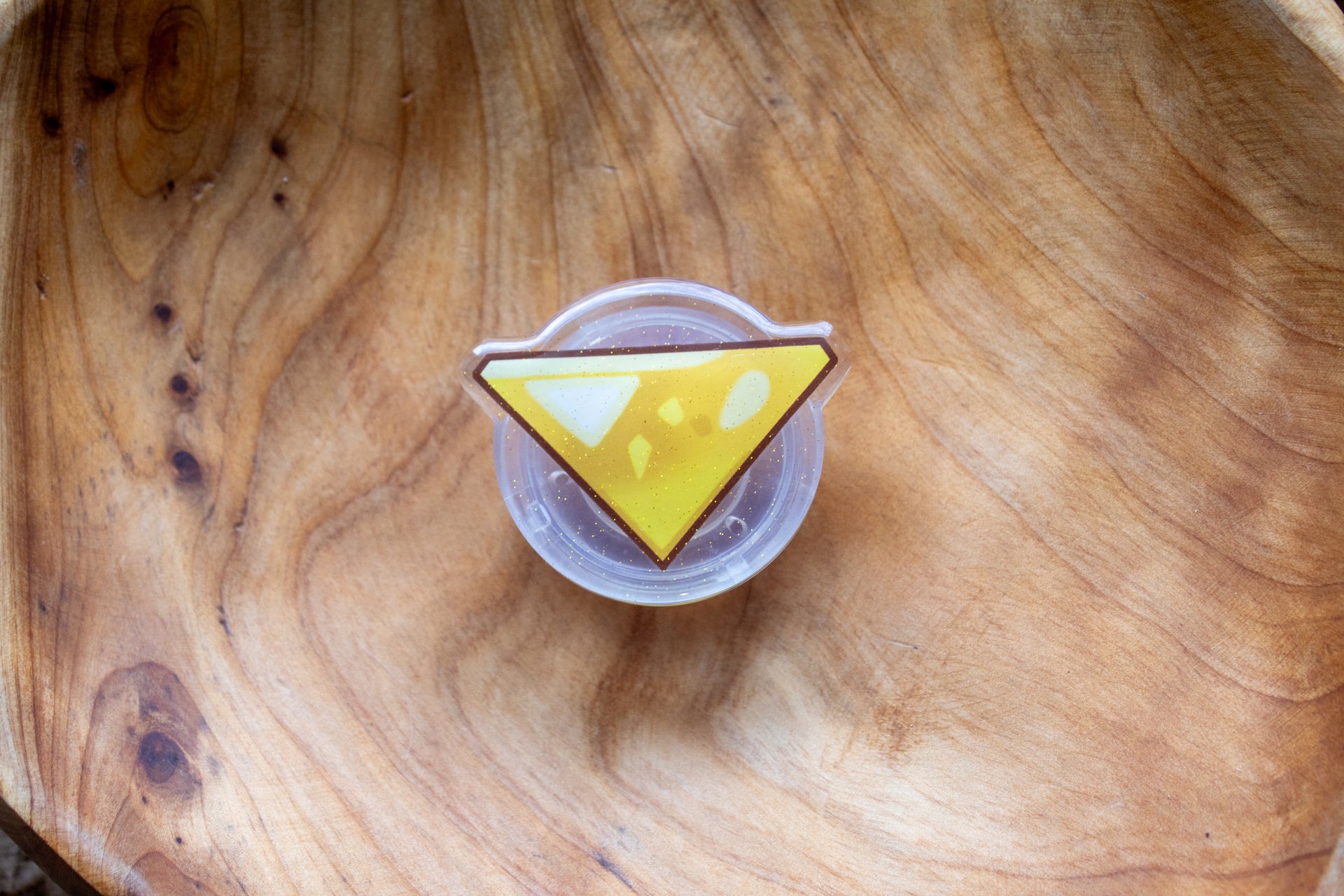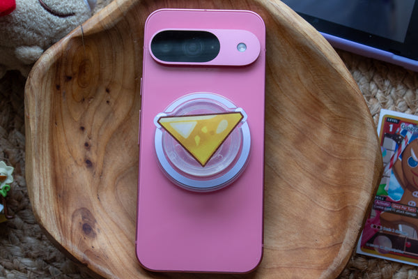 Get a grip on your device with this glittery acrylic Golden Cheese Soul Jam grip! This must-have device accessory features a glitter epoxy-domed design, a clear adhesive backing for a secure hold, and a tiered silicone joint for popping the grip up or down for maximum comfort in your hand.