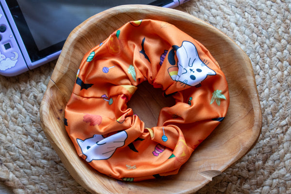 - Features an assortment of autumn leaves, ghost cats, candies, and cat pumpkins on an orange gradient background