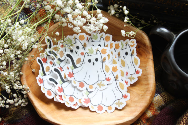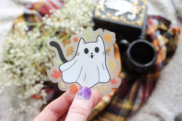 Ghost Cat Leaves 3" Clear Vinyl Stickers
