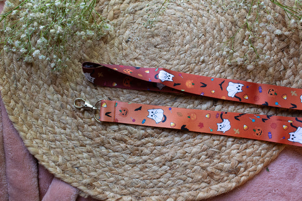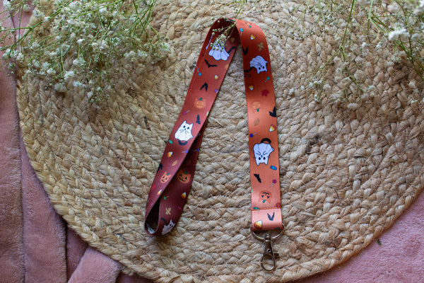 - Features an assortment of autumn leaves, ghost cats, candies, and cat pumpkins on an orange gradient background
